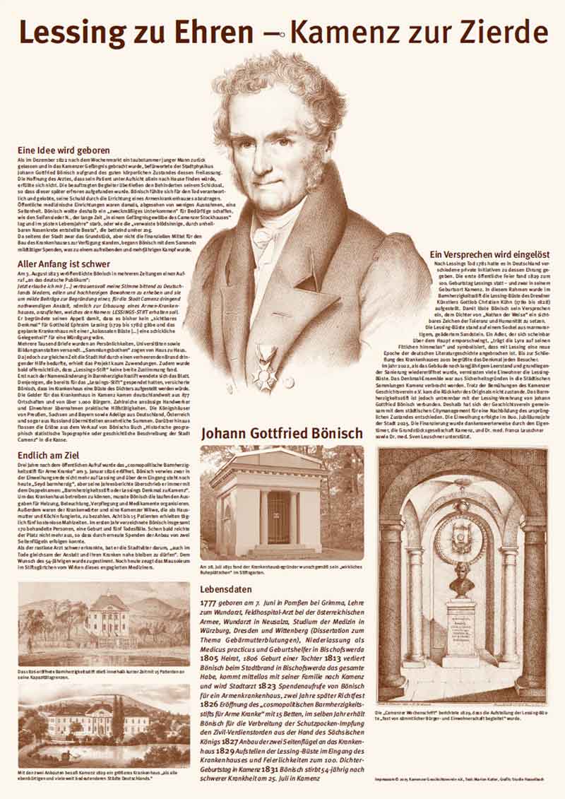 Das alte Kamenzer Krankenhaus ist untrennbar mit der Lessing-Verehrung seines Begründers Johann Gottfried Bönisch (1777 bis 1831) verbunden. Seit der Eröffnung des sanierten Gebäudes 2022 vermissten viele Kamenzer das Denkmal im Eingangsbereich, das durch den Mediziner zum 100. Geburtstag des Dichters aufgestellt worden war.